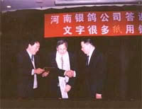 最為值得一提的是,銀鴿公司正式聘請中國工程院院士、俄羅斯科學院外籍院士、著名經濟學家李京文先生為銀鴿公司高級經濟顧問。會上,漯河市委副書記吳長忠、銀鴿公司董事長楊松賀正式為李京文先生頒發了聘書,歡迎李院士將以淵博的學識為銀鴿公司的發展指點迷津,以智者的敏銳為銀鴿的將來做宏觀指導。李院士的加盟,不僅給銀鴿的領導班子提供強有力的智力支持,同時也反映出銀鴿日漸壯大的實力,以及聘用高級人才再度輝煌、崛起中原的決心。