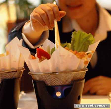 菜品及湯料都可以直接盛入紙鍋中,然后就把紙鍋放在一只小爐上,點(diǎn)燃爐里的酒精加熱。與一般火鍋相比,紙火鍋更“專一”,分為海鮮鍋和水煮鍋、糖醋鍋等多種,顧客可以根據(jù)自己的喜好一邊燙一邊吃。由于紙鍋是特殊材質(zhì)制成,只要食用過程中不戳破鍋底,可在高溫下烹煮3小時(shí)。