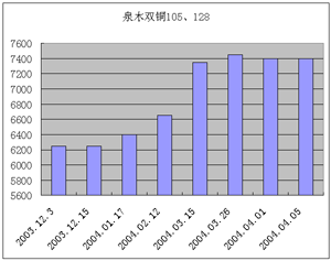 從2003年12月開始,金東開始了一波緊勢一波的漲價浪潮,太空梭80g銅版紙從8000元猛增到現(xiàn)在的9000元,其105-250g銅版紙上漲幅度更大,接近上漲1400元/噸,目前價格達到8500元/噸。銅版紙價格漲幅在不到兩個月的時間內(nèi)竟然達到12%-18%,,漲幅之大,時間之快,今年罕見。