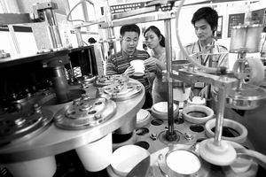 昨天,“第二屆中國造紙工業博覽會”在農展館舉辦。記者發現,參展的多為中小企業,本土造紙巨頭如華泰、晨鳴和金光等悉數缺席。組委會相關人員解釋,前不久在山東剛剛召開了一次大型造紙博覽會,許多大型造紙企業不愿再到北京折騰。而據白云紙業某銷售部人士介紹:“知名紙業一般不出席這種博覽會,而是對大型訂購會更感興趣。”圖為參展的一款新型方便面紙碗機。該機每分鐘能產出35-45個紙碗,比傳統的紙碗機每分鐘產量提高20個左右。(記者 劉軍 夏命群 攝影報道)