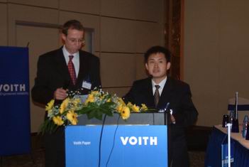 25日早上9點,“超越2004”客戶技術交流會正式開始,福伊特造紙技術中國區總裁劉明明女士首先致歡迎辭。劉明明說,幾十年前,VOITH就是業內被認為是第一流的設備供應商并建立了造紙技術的標準,并以其服務、技術實力和與眾不同的、專業化的項目管理而著稱。所有這些標準都是成功的造紙生產的基礎,但實現長期成功的、具有決定意義的關鍵詞卻是可靠性!邀請各位出席這次交流會,福伊特將向各位提供VOITH的信息、技術以及全面的服務。我們確信只有從漿料制備到造紙設備以及整飾和包裝的完美工藝技術才對高效率的生產工藝具有重要作用。為此邀請大家聽一聽演講,并提出問題,共同進行深入的討論和對話。