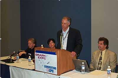 鄧恩先生(站立者)在Graph Expo的總結會上發言