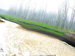 原來,河水白天不漲晚上漲的真相是企業偷排污水。但是,以黃板紙廠的生產規模,還不足以污染一條洪河。為找到更多的證據,記者溯流而上,在舞陽縣舞永鎮馬橋村西側,發現一股黑水和一股黃水交匯一處注入洪河。黑水上游約4公里處便是舞鋼市的造紙企業———海明集團有限責任公司,黃水上游約1.5公里處則是舞陽縣華裕水泥有限責任公司。同樣,在舞陽縣三里河造紙廠左側的河邊,記者找到了該企業的排污口,盡管是白天,但流出的水依然泛著白色泡沫。