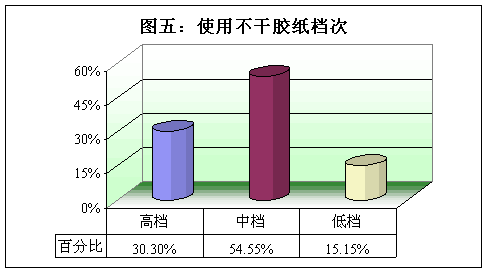 國內(nèi)企業(yè)目前使用的不干膠紙檔次還是以中檔為主,有54%多的企業(yè)主要使用中檔不干膠紙。這和當(dāng)前我國經(jīng)濟(jì)整體發(fā)展水平是相適應(yīng)的。國內(nèi)客戶消費(fèi)能力還有限,更多的還是使用中檔品質(zhì)的不干膠紙。
