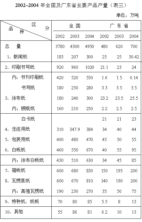 2004年,根據省統計局對規模以上291家造紙企業統計,機制紙及紙板產量598萬噸,增長12.1%;工業總產值240.76億元,增長15.63%;銷售收入233.25億元,增長12.85%;利潤8.73億元,增長20.9%。去年,雖然遇到電力、原材料緊缺、漲價的強大壓力,第一次出現低于全國平均發展速度的情況,由于企業加強內部管理,改善經營,利潤增幅大大超過全國平均增長12.51%的水平。出口產值完成51.75億元,增長18.51%。造紙工業產值、銷售收入、產量居全國同行第三位,利潤和出口產值分別居全國同行第五位和第一位。重點品種新聞紙,完成30.42萬噸,比上年增長22.83%,居全國第二位。