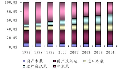 根據(jù)中國造紙協(xié)會對綜合信息資料調(diào)查,從2000 年到2004 年,全國漿耗總量4 年的平均復合增長率達12.47%,期間各類漿耗量中增長最快的依次是進口廢紙漿、進口木漿和國產(chǎn)廢紙漿;廢紙漿和木漿占漿耗總量的比例明顯提高,非木漿比例明顯下降,進口廢紙漿和進口木漿占漿耗總量的比例也明顯增大;非木漿的消耗量基本保持平穩(wěn),國產(chǎn)木漿消耗量保持平穩(wěn)增長,但國產(chǎn)木漿占漿耗總量的比例逐年下降。