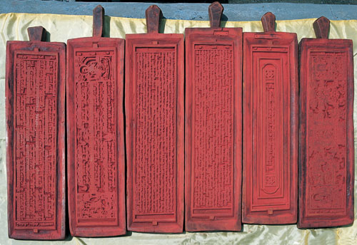 我看到印刷經文有的呈黑色,有的呈紅色,便問雄嘎是怎么回事,他解釋道:藏文經書分墨汁版和朱砂版兩種類型,因印刷的顏色不同而異,像《甘珠爾》、《般若波羅密多經八千頌》就要用朱砂印刷。傳統的藏墨是用杜鵑樹皮燃燒以后的煙灰制作,以水和牛膠調制;朱砂則來自西藏、印度和內地。朱砂版的經書比較珍貴,價錢也比墨版的高許多。