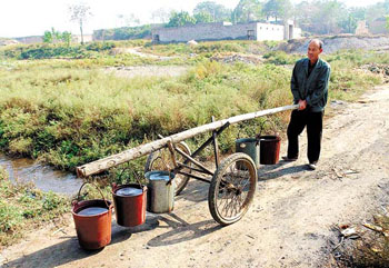 在村北,記者看見村民楊北鎖正在用簡易的架子車往家送水。記者得知,現在他們隊的居民生活用水不得不靠村南的自來水供應,以前吃水不掏錢,現在每人每月得掏1.5元錢的水費。