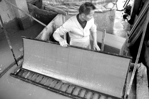 造紙的師傅告訴我,紙張的厚薄就看師傅的手勢了,輕蕩則薄,重撈則厚,古人還總結出“柔輕拍浪”、“持簾迎浪而上”、“抄漿著簾的一瞬間震動紙簾”三句口訣。看似簡單的幾個動作卻不是那么容易完成的,我征求師傅同意后嘗試了幾把,根本無法做出達到要求的紙胚樣。紙坯經過絞機壓榨擠掉水分、風干,接著就是松紙工序,松紙一般都由老人來完成,因為它講求的是技術而不是力度。老人右手用一柄特制的木板敲打切撥紙坯,左手不斷翻弄,紙張便松開呈一頁頁。松紙看似簡單,實則相當不易,稍有不慎,就會造成紙張破損。老人告訴我:不學習個兩三年是很難達到熟練自如的程度的。