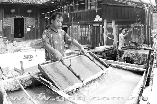 古法造紙促進當地旅游業的發展,今年上半年,村里接待游客2000多人次,拉動消費20多萬元。圖為當地傳統的手工造紙作坊。