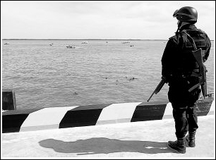 8月29日,一名士兵在烏拉圭建成的新帕爾米拉碼頭附近注視著在烏拉圭河上抗議的阿根廷居民。當天,烏拉圭科羅尼亞省的新帕爾米拉碼頭建成,烏總統(tǒng)塔瓦雷•巴斯克斯出席了剪彩儀式。新帕爾米拉碼頭將被用作烏拉圭和阿根廷邊境烏方一座受爭議大型造紙廠的中轉港。阿根廷居民擔心造紙廠將對環(huán)境造成污染并影響到本國旅游業(yè)和捕魚業(yè)。新華社發(fā)(尼古拉斯•賽拉亞攝)