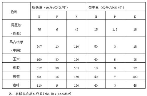 桉樹與其它作物吸收和帶走的礦質(zhì)營養(yǎng)量比較