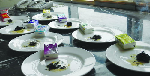 將面巾紙點燃后,記者將每一種都放進一個白色瓷盤內,很快盤底就出現了黃色痕跡,用手摸上去感覺有點油,紙灰也帶有一點粘性。