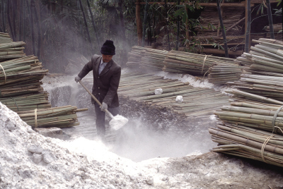 刷:把竹料疊排放進腌塘中,投入礪灰進行腌制。腌制就是去除竹料中的木質(zhì)素,提純植物纖維。紙農(nóng)叫這種腌制的竹料為“刷”。“刷”在腌塘中浸泡期間要上下翻動,使腌制均勻,這叫翻塘。“刷” 漚熟了要從腌塘中撈起,曬干備用。