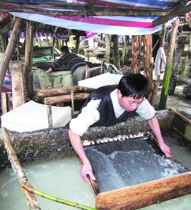 走進貞豐縣小屯鄉龍井村,公路旁邊不少塑料棚搭的房子就是小屯古法造紙的生產車間了。記者了解到,當地仍保存著一套完整的以樹皮、仙人掌為原料的造紙工藝,其72道造紙工藝古樸自然,與古人宋應星《天工開物》一書中所描述的完全一致,被譽為古代造紙術的“活化石”。2005年,當地政府將該生產工藝申報首批國家級非物質文化遺產保護代表作并獲得成功。
