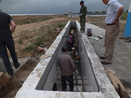 盡管雙燈吳副總在記者面前承認并得到證實從去年4月開始投建的號稱日處理2萬噸污水處理廠一直還沒有投入使用,但排污意志堅韌的“雙燈”仍然一如既往地將每日數以千萬噸的沒有處理的黑色污水直接排放到“生態蘆葦蕩”。(圖為采訪當日下午,吳總帶領記者察看還在修建的污水處理廠排污口設施)