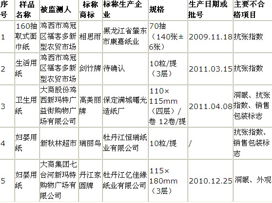 2011年二季度,黑龍江省工商行政管理局委托哈爾濱市產品質量監督檢驗院依據《衛生紙》GB20810—2006、《紙巾紙》GB/T20808—2006、《紙尿褲》QB/T2493-2000等標準,對雞西、七臺河市的7家經銷單位銷售的29批次衛生紙、紙巾紙、紙尿褲的定量、亮度、橫向吸液高度、抗張指數、縱向濕抗張強度、柔軟度縱橫向平均、細菌菌落數、大腸菌群、致病性化膿菌、真菌菌落總數、交貨水份、洞眼、塵埃度、外觀、銷售包裝標志等項目進行了檢測。經檢測,合格23批次,合格率79%;不合格6批次,不合格率21%。