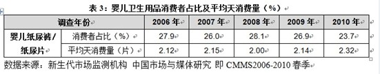 嬰兒紙尿褲在有0-6歲孩子的家庭中,使用率接近25%,2010年略有下滑,但是平均消費量有所上升,整個市場基本維持穩定。從區域差異看,華中地區嬰兒紙尿褲市場有所增長,華南、西部地區消費人群基本穩定,人均消費量略有上升;東北區域,消費量略有下滑。