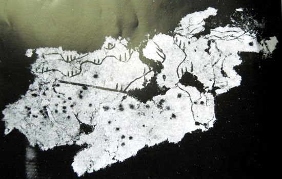 天水放馬灘西漢初年5號墓出土的紙質地圖。該圖殘長5.6厘米、寬2.6厘米,經文物考古專家斷定為西漢文帝或景帝(公元前179年-前143年)時期的紙質地圖