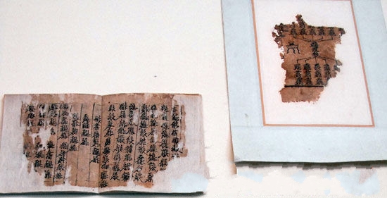 甘肅博物館館藏的敦煌出土的懸泉墨書紙,公元265年到316年。懸泉紙是1992年在甘肅敦煌懸泉置遺址發現的。該遺址共出土紙張470余件,其中寫有文字的紙殘片10件,時代從西漢武、昭帝始,經宣、元、成帝至東漢初及晉。 中國甘肅位于陸上絲綢古道,從東部的天水至西部的敦煌橫跨1600多公里,加上多數地區氣候干燥,境內古紙遺存十分豐厚,是見證中國古代造紙業發展歷史的“自然博物館”。