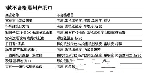 廣東省工商局近日通報全省流通領域紙巾紙質量監測情況,抽檢結果顯示超過七成不合格,其中9款惠州產紙巾產品被檢出使用熒光增白劑(有潛在致癌危險的化學品)、細菌菌落總數超標等問題,被列入省工商局抽檢黑榜遭曝光。
