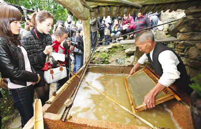 游客在湖嶺鎮(zhèn)東元村觀看83歲的村民尹日錫撈紙