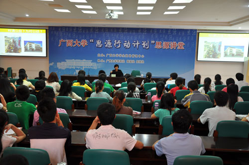 2012年4月11日下午,金光集團黃奕聰慈善基金會校園公益宣講在廣西大學(xué)開講,黃奕聰慈善基金會秘書長蘇薔華女士在廣西大學(xué)“思源講堂”為大學(xué)生做了“你今天大學(xué)生了沒”的公益主題宣講,此次宣講,是黃奕聰慈善基金會高校獎學(xué)金暨校園宣講公益項目2011學(xué)年“走進校園”的一部分。