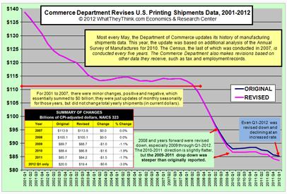以現值美元為基礎,美國商務部將2009年、2010年及2011年的商業印刷出貨總量的統計數字分別修正到了829億美元、825億美元和816億美元,與之前相比分別下調了9.42億美元、15.6億美元以及17.6億美元。