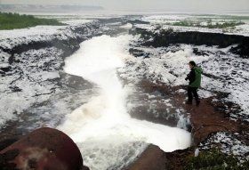 垃圾山就在廣源麻業廠房的后面,與廠房僅一墻之隔。再往前,便是洞庭湖。一個巨大的排污口從垃圾堆下面的泥地里伸出,黃色的污水正不斷地噴涌而出,沖擊出層層白色泡沫。與此同時,廠房的煙囪黑煙滾滾,空氣中飄散著一股刺鼻的臭味。