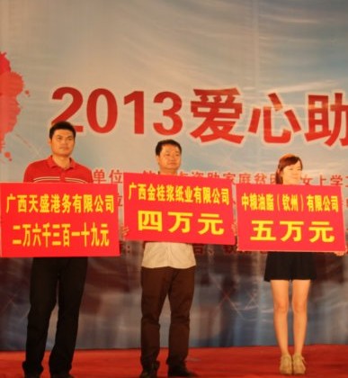 8月22日,在廣西壯族自治區(qū)欽州市舉辦的“情滿欽州——2013年愛心助學晚會”上,廣西金桂漿紙業(yè)有限公司捐資4萬元,以幫助貧困大學生完成學業(yè)。