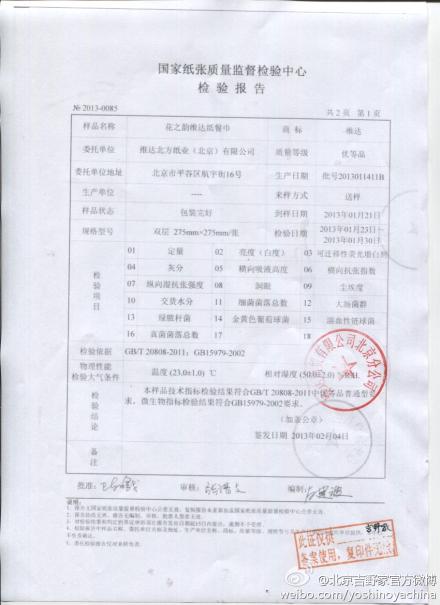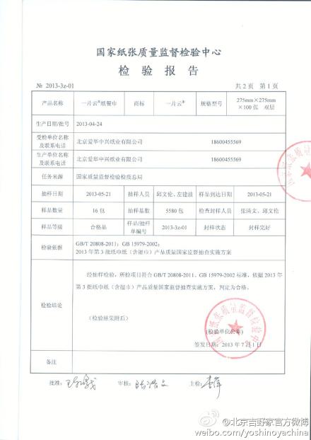 吉野家官方回應(yīng)稱,吉野家、DQ餐廳使用維達(dá)北方紙業(yè)(北京)有限公司的“花之韻維達(dá)紙餐巾”和北京愛華中興紙業(yè)有限公司的“一片云餐巾紙”。兩款產(chǎn)品均具有國家紙張質(zhì)量監(jiān)督檢驗(yàn)中心出具的批次檢測報(bào)告,報(bào)告中“可遷移性熒光增白劑”標(biāo)準(zhǔn)值、實(shí)測值均為“無”。檢測報(bào)告可追溯,請消費(fèi)者放心使用。