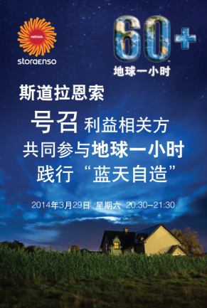 在世界第八個(gè)“地球一小時(shí)”活動(dòng)來臨之際,斯道拉恩索中國區(qū)邀請(qǐng)全體員工、客戶、供應(yīng)商、社區(qū)群眾等利益相關(guān)方關(guān)注并加入“地球一小時(shí)”活動(dòng)中,于2014年3月29日晚20:30—21:30熄燈一小時(shí),為環(huán)境保護(hù)、節(jié)能減排貢獻(xiàn)自己的力量!暗厍蛞恍r(shí)”是世界自然基金會(huì)(WWF)應(yīng)對(duì)全球氣候變化所提出的一項(xiàng)倡議,希望個(gè)人、社區(qū)、企業(yè)和政府在每年三月最后一個(gè)星期六的晚上熄燈一小時(shí),以表明應(yīng)對(duì)氣候變化行動(dòng)的支持。
