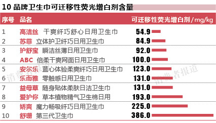 另一宣稱不含該熒光增白劑的臺灣品牌愛護你衛生巾,含量也高達193mg/kg,排名倒數第三。