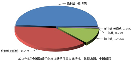 2014年5月,紙制品完成出口額6.24億美元(占48.75%),同比增長3.67%。緊隨其后的是機(jī)制紙及紙板及加工紙行業(yè),分別占38.29%和12.05%。