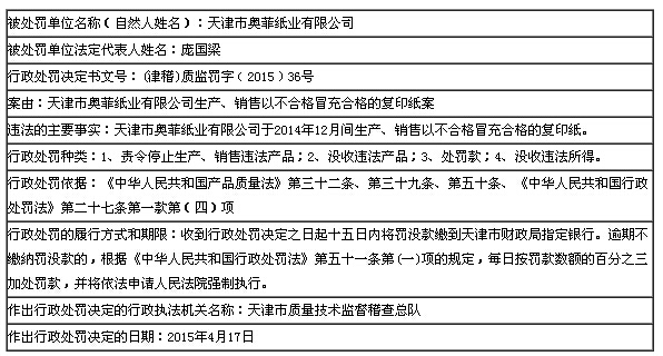 天津市市場和質量監(jiān)督管理委員會近日公開天津市奧菲紙業(yè)有限公司生產(chǎn)、銷售以不合格冒充合格的復印紙案件信息,詳情如下: