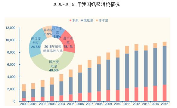 我國是全球紙漿量消耗最高的國家,在我國紙和紙板的生產消費仍在穩定增長的情況下,主要造紙原材料之一的——紙漿,需求十分旺盛。而由于我國造紙原料結構長期以非木材纖維為主,木漿及高檔紙漿嚴重短缺,因此進口依賴度較高。從上游消耗紙漿比例來看,目前我國是以廢紙漿作為主要造紙原材料,2015年廢紙漿占比約65%左右,自2000年起廢紙漿已替代非木漿成為行業主要原料來源。