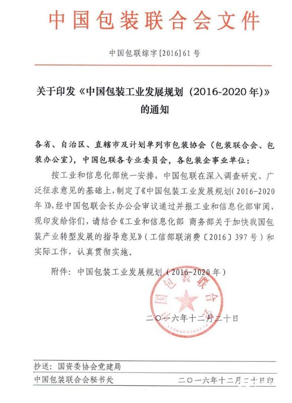 關于印發《中國包裝工業發展規劃(2016-2020年)》的通知