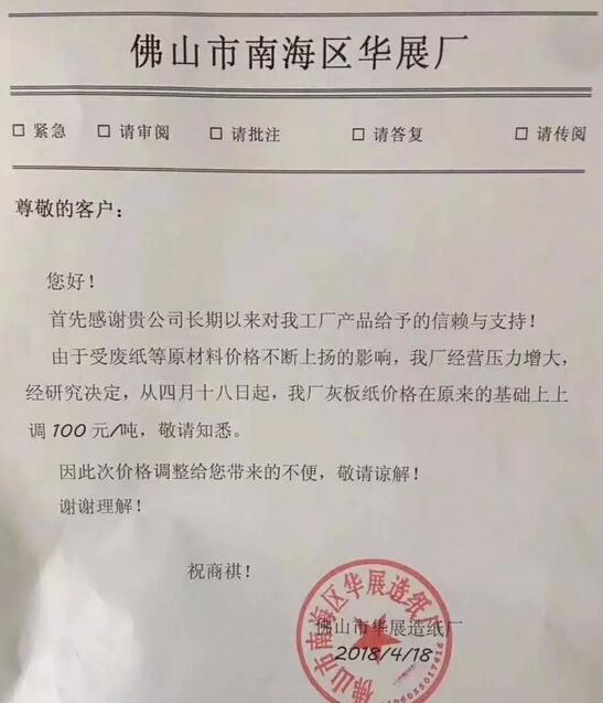 (2)原因探析:廢紙價格變幻不定 事實上,在本月,紙價上漲的情況并不少見。比如衛(wèi)生紙,從春節(jié)至今,其累計漲幅已高達(dá)10%-20%。然而包裝紙的市場行情卻并不同,從3月底至4月上旬,包裝紙價格受需求影響,始終處于低迷狀態(tài),不少中小紙廠甚至降價100-200元/噸。 既然如此,那為何紙價走勢又會轉(zhuǎn)而向上呢? 按照紙廠的說法來看,此番紙價上漲是因為成本上升所推動。如浙江高陽紙業(yè)公司表示,因進(jìn)口、國廢,化工原料、燃煤等原材料和與運費的急劇上漲,造成生產(chǎn)成本大幅上升;又如玉田縣大眾寶來紙業(yè)有限公司所言,由于廢紙成本及環(huán)保成本上升,決定紙價上調(diào)。 詳情可見: 新一輪漲價,新增APP等12家紙廠提價100-500元/噸!紙價將如何走向呢? 新增5家紙廠漲價,最高再漲500元/噸!全國廢紙價格最高上調(diào)200元/噸! 紙廠再漲500元/噸!多地再現(xiàn)關(guān)停潮,2018年將迎來更嚴(yán)環(huán)保風(fēng)暴! 最新漲價通知: