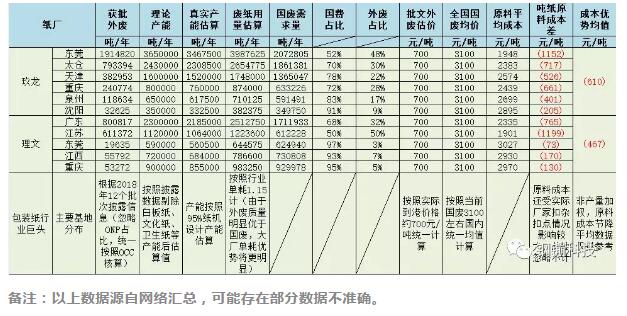 未來原料結構調整,國廢價格上漲幾率較大 按照國家政策要求,在2020年左右,我國完全禁止進口外廢,在我國外廢大量減少,國廢原料無法滿足造紙需求的情況下,迫使造紙行業對原料進行優化。造紙原料優化主要從三方面考慮:紙漿(林木產業)、國廢回收率提升、其他造紙材料的開發! 一是大力發展林木產業,建立原生纖維基地林,培育速生、豐產、優質林木,走“林、漿、紙一體化”之路;那么目前來看,我國的晨鳴紙業、理文造紙、APP等紙企在以往的林木產業投資商都獲得很好的回報,在2017年,這些紙企都在大力加碼這一產業。在2018年,大家應該重點關注玖龍紙業在云南的投資洽談,其中有部分投資涉及林木產業,是值得未來關注的。 二是加大廢紙回收的力度,大量使用木漿廢紙。這一方法得到我國政府的大力支持,例如政府提出的“兩網融合”等政策,都在間接支持其發展。在行業來看,重慶新建再生資源回收交易平臺,2018年玖龍紙業也在天津洽談,意在投資500億,建立再生資源交易平臺。在社會上,互聯網+再生資源回收模式層出不窮,也是頗受社會資本關注。 三是充分利用蘆葦、麥草等資源上風,更加科學、公道地利用非木材纖維,從而減輕紙板木材纖維原料供給帶來的風險。這是一個較為優勢的原料優化路徑,在2017年永豐余就實現利用蘆葦造紙技術。這利于造紙行業發展。 但是,造紙原料結構的調整是個漫長的過程,無法快速有效的解決當前的市場困境。中國目前出現了消費降級現象,并導致終端品牌遲遲不能將原材料漲價的成本傳導給消費者,下游二級紙板廠受到產能過剩和訂單不足的影響,一直采取低庫存運行的策略,不再大量加倉,穩守一個月左右的倉位。 那么經過上一輪高價搶國廢后,紙廠庫存得到補充,暫時相對緩和下來。等到下一輪補庫存,或將繼續大幅上漲。 總結:得國廢者將得天下,維持穩定的廢紙供應才是當前乃至未來工作的重中之重 眾所周知,原料成本占總體制造成本比例約70%,因此對于原料價格的波動,時刻成為牽動造紙廠最為關鍵的那根神經。根據下表數據分析,當前大廠明顯具備原料價格優勢,小廠原料成本相對較高,且成本控制能力缺乏。 表1