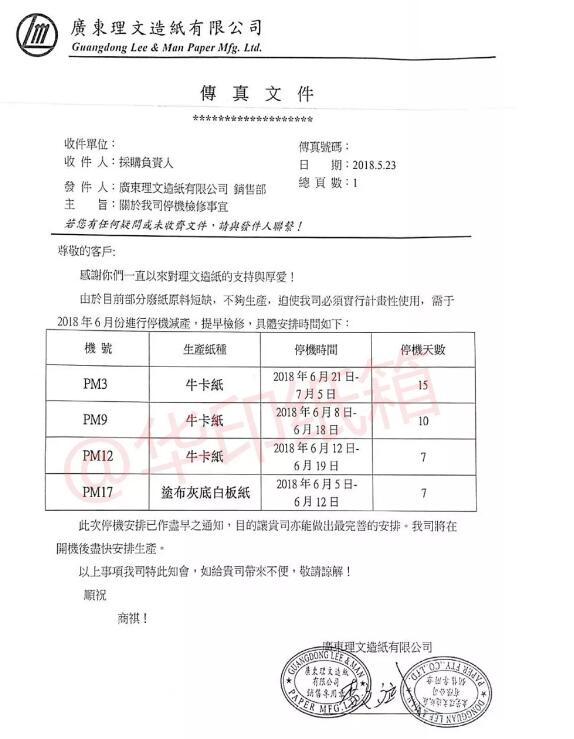 破天荒!又一造紙巨頭廣東理文造紙有限公司5月23日對外宣布4臺紙機停機檢修7-15天不等。在年中造紙巨頭理文停機檢修是史無前例的。繼今年湖北榮成、東莞建暉及福建聯盛短暫停機或停單后,又一造紙巨頭加入停機檢修行列,主要原因皆因進口廢紙原料短缺所致。如今進口廢紙受政策原因將持續供不應求,下一個突然宣傳停機檢修的又會是誰呢? 理文4臺紙機停機檢修,涉及牛卡紙及涂布灰底白板紙