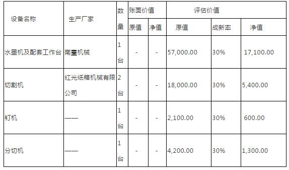 近期,10家紙企、紙包裝廠的廠房、設(shè)備、土地、排污權(quán)等資產(chǎn)即將被公開拍賣,需要購買廠房、二手設(shè)備的企業(yè)可以關(guān)注。 1.東明縣今明紙箱包裝有限公司的廠房、機(jī)械設(shè)備 拍賣時(shí)間:2018年6月11日10時(shí)至2018年6月12日10時(shí)止(延時(shí)除外) 拍賣平臺:東明縣人民法院阿里巴巴司法拍賣網(wǎng)絡(luò)平臺上(法院賬戶名:東明縣人民法院,法院主頁網(wǎng)址:sf.taobao.com/區(qū)號——參見全國法院頁面:https://sf.taobao.com/court_list.htm) 拍賣標(biāo)的:東明縣今明紙箱包裝有限公司的廠房、機(jī)械設(shè)備。廠房建筑結(jié)構(gòu):鋼結(jié)構(gòu);廠房面積948.56平方米;機(jī)械設(shè)備:平壓壓痕切線機(jī)、平壓壓痕切線機(jī)、對開切紙機(jī)、壓線機(jī)等共20臺。 起拍價(jià):578058元,保證金:5萬元,增價(jià)幅度:1000元。 咨詢電話:0530-7126572李庭長 2.佛山市南海區(qū)俊昭達(dá)紙品包裝廠所有的機(jī)械設(shè)備一批 拍賣時(shí)間:2018年6月11日10時(shí)起至2018年6月12日10時(shí)止(延時(shí)的除外) 拍賣平臺:廣東省佛山市南海區(qū)人民法院淘寶網(wǎng)司法拍賣(變賣)網(wǎng)絡(luò)平臺(網(wǎng)址:http://sf.taobao.com/0757/06,戶名:佛山市南海區(qū)人民法院) 拍賣標(biāo)的物:佛山市南海區(qū)俊昭達(dá)紙品包裝廠所有的機(jī)械設(shè)備一批(具體名稱、數(shù)量、規(guī)格型號等詳見標(biāo)的物介紹),現(xiàn)存放于佛山市南海區(qū)獅山鎮(zhèn)小塘新境工業(yè)區(qū)內(nèi)。 固定資產(chǎn)—機(jī)器設(shè)備評估明細(xì)表  起拍價(jià)(保留價(jià)):人民幣17080元,保證金人民幣1700元,加價(jià)幅度人民幣1000元及其倍數(shù)。 法院咨詢電話:0757-81852507、81852092 3.寧波**包裝有限公司的一批機(jī)器設(shè)備 拍賣時(shí)間:2018年6月14日10時(shí)至2018年6月15日10時(shí)止(延時(shí)的除外) 拍賣平臺:浙江省寧波市中級人民法院淘寶網(wǎng)司法拍賣網(wǎng)絡(luò)平臺上(網(wǎng)址:http://sf.taobao.com,戶名:浙江省寧波市中級人民法院) 拍賣標(biāo)的:寧波**包裝有限公司的一批機(jī)器設(shè)備 起拍價(jià):40.7萬元,保證金:5萬元,增價(jià)幅度:0.5萬元。 法院咨詢電話:0574—55713325 4.海寧市佳宏包裝有限公司所有的五層瓦楞紙板生產(chǎn)線一條 拍賣時(shí)間:2018年6月21日10時(shí)至2018年6月22日10時(shí)止(延時(shí)的除外) 拍賣平臺:浙江省海寧市人民法院淘寶網(wǎng)司法拍賣網(wǎng)絡(luò)平臺上(網(wǎng)址:https://sf.taobao.com/0573/06,戶名:海寧市人民法院) 拍賣標(biāo)的物:海寧市佳宏包裝有限公司所有的型號為KH-C300-25D五層瓦楞紙板生產(chǎn)線一條(該生產(chǎn)線無控制系統(tǒng)及缺失瓦楞棍2對)。標(biāo)的物狀況以現(xiàn)場實(shí)物為準(zhǔn),務(wù)必請各競買人到現(xiàn)場進(jìn)行實(shí)地看樣。 起拍價(jià):221.6萬元,保證金:40萬元,增價(jià)幅度5000元及其整倍數(shù)。 咨詢電話:0573-89232016 5.九江金瑞紙箱包裝廠名下工業(yè)用地及地上建筑物 拍賣時(shí)間:2018年6月24日10時(shí)至2018年6月25日10時(shí)止(延時(shí)除外) 拍賣平臺:九江縣人民法院淘寶網(wǎng)司法拍賣網(wǎng)絡(luò)平臺上(網(wǎng)址:https://sf.taobao.com/0792/06),戶名:九江縣人民法院) 拍賣標(biāo)的:本次拍賣對象為九江金瑞紙箱包裝廠名下在九江縣的工業(yè)用地一塊(證號:贛2016九江縣第0000183)及地上建筑物(地上建筑物未辦理房產(chǎn)證)。土地面積9333平方米,坐落九江縣赤湖工業(yè)園通江大道北輕工業(yè)園內(nèi),用途工業(yè)用地,土地使用權(quán)類型國有出讓,使用期限50年(2016年4月8日起2066年4月7日止)。鑒定現(xiàn)場顯示,涉案評估用地范圍存在工業(yè)用地一塊,鋼結(jié)構(gòu)廠房二幢,辦公樓一幢,鋼棚庫房一處,公共廁所一處及廠大門、圍墻及場地硬化等地上建筑物。 該地塊已被抵押給九江縣農(nóng)村信用合作聯(lián)社港口信用社,抵押面積:9333平方米,履行債務(wù)期限:2016-05-17起2019-05-16止,抵押方式:一般抵押。該地塊1#車間隔開和部分辦公樓承租給某化工材料公司,租賃期:2017年6月15日至2020年6月14日止。 起拍價(jià):4237848.78元,評估價(jià):5650465.04元;保證金:400000元,加價(jià)幅度:10000元。 標(biāo)的物詳情咨詢電話:0792-6810249(潘法官) 6.(破)債務(wù)人浙江天基紙業(yè)有限公司所有的排污權(quán) 拍賣時(shí)間:2018年6月12日10時(shí)至2018年6月13日10時(shí)止(延時(shí)的除外) 拍賣平臺:阿里巴巴司法拍賣網(wǎng)絡(luò)平臺上進(jìn)行公開拍賣活動(dòng)(法院賬戶名:嵊州市人民法院,法院主頁網(wǎng)址:sf.taobao.com/0575/07——參見全國法院頁面:https://sf.taobao.com/court_list.htm) 拍賣標(biāo)的:浙江天基紙業(yè)有限公司所有的排污權(quán),持有編號為浙DE2014A0102號排污許可證,擬為廢水排放量339600噸/年(化學(xué)需氧量16.98噸/年、氨氮2.75噸/年)、二氧化硫24噸/年、氮氧化物26.9噸/年。排污權(quán)有效期至2020年12月31日。 起拍價(jià):評估價(jià)6075494元,起拍價(jià)4252846元,保證金552870元,增價(jià)幅度10000元。 咨詢電話:0575-85113105(尹律師)破產(chǎn)管理人 7.山東天健紙業(yè)有限公司所屬財(cái)產(chǎn)一宗 拍賣時(shí)間:2018年6月12日10時(shí)至2018年6月13日10時(shí)止(延時(shí)除外) 拍賣平臺:淄博市淄川區(qū)人民法院阿里巴