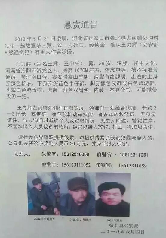 5月31日凌晨,張北縣大河鄉公溝村發生了一起故意殺人案,該村一獨居家中飼弄牲畜的養牛戶,被其雇工殺死在家中,由于案發時間是半夜,加之村中人口稀少、居住分散,待村民發現時已是次日早晨,雖然發現兇案后當即撥打110報警,但當警察趕來時,涉嫌殺人的雇工早已跑的不見蹤影。 數日后,嫌犯遺留的血跡的DNA比對檢驗結果形成,張北縣公安局民警發現,該嫌犯是此前曾在河南、河北、山西作案多起,殺害5人,重傷1人,逃亡12年的公安部A級通緝犯王力輝。 據了解,該嫌疑人為男性,40歲左右,身高一米七左右,長臉,絡腮胡,中等身材,操不標準的普通話,帶河南口音。案發時蓄山羊胡,兩鬢有絡腮胡,出逃時上身穿深色棉衣,下身穿深藍色牛仔褲,腳穿黑色皮鞋或白色旅游鞋,頭戴白色鴨舌帽,攜帶一藍色雙肩包,內裝一本算命書,可能攜帶尖刀一把,是一個極度危險的人物。