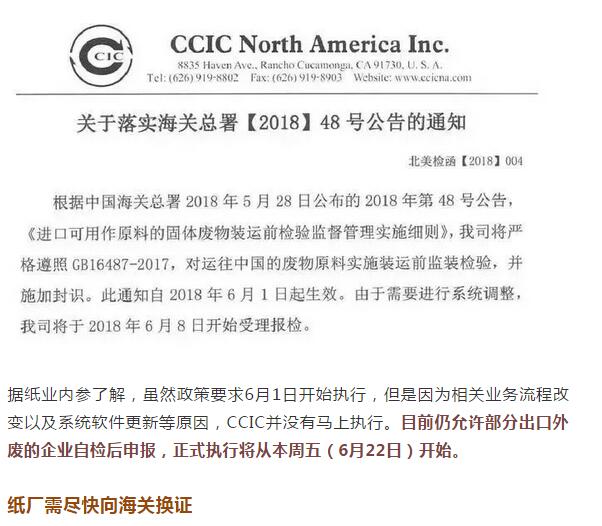 據紙業內參了解,雖然政策要求6月1日開始執行,但是因為相關業務流程改變以及系統軟件更新等原因,CCIC并沒有馬上執行。目前仍允許部分出口外廢的企業自檢后申報,正式執行將從本周五(6月22日)開始。