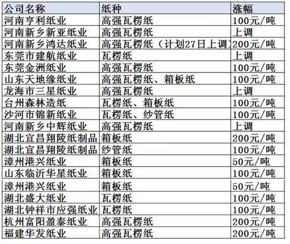 6月25日山東壽光魯麗紙業箱板紙價格計劃上調100元/噸。調后出廠含稅現金價:再生箱板紙A2級130g/140g報4800元/噸,165g及以上報4750元/噸。承兌價格在此基礎上增加100元/噸。 6月25日山東天地緣紙業箱板紙價格上調100元/噸,目前一般客戶出廠含稅承兌價:再生箱板紙110g報4900元/噸,130-160g報4800元/噸。現金價格在此基礎上下調80元/噸。高強瓦楞紙價格上調100元/噸,目前一般客戶出廠含稅承兌價格:高強瓦楞紙110-140g報4500元/噸。現金價格在此基礎上下調80元/噸。 6月25日山東臨沂華星紙業箱板紙價格上調100元/噸,目前出廠含稅現金價:箱板紙110g報4800元/噸,130g/140g報4700元/噸。 6月25日山東臨沂利華紙業瓦楞紙價格上調100元/噸,高瓦120克報4500元/噸;箱板紙價格上漲100元/噸,仿牛卡110克報4600元/噸。 6月25日東莞金洲紙業高強瓦楞紙價格上調100元/噸。目前調后出廠含稅現金價:高強瓦楞紙110g報5210元/噸,120g報5110元/噸,130g/140g報5110元/噸。 6月25日福建漳州港興紙業箱板紙價格上調50元/噸。目前出廠含稅現金價:箱板紙A2級130g報5450元/噸,160-220g報5400元/噸。承兌價格在此基礎上加100元/噸。 6月25日河南龍源紙業箱板紙價格上調200元/噸,目前出廠含稅現金價:環保箱板紙120g報4850元/噸,140g/170g報4800元/噸。承兌價格在此基礎上上調70元/噸。瓦楞紙價格上調200元/噸,目前出廠含稅現金價:AA級高強瓦楞紙120g報4630元/噸,130-170g報4600元/噸。承兌價格在此基礎上上調70元/噸。 6月25日河南新鄉新亞紙業瓦楞紙價格上調150元/噸,高瓦120克報4550元/噸(出廠含稅現金)。 6月25日湖北盛大紙業瓦楞紙價格上調100元/噸,高瓦120克報4700元/噸(出廠含稅現金)。 6月25日湖北鐘祥市應強紙業瓦楞紙價格上調100元/噸,高瓦120克報4600元/噸(出廠含稅現金)。 6月22日沙河市錦新紙業A級高強瓦楞紙價格上調100元/噸,紗管紙價格上調100元/噸。 6月22日杭州富陽盈泰紙業高強瓦楞紙價格上調200元/噸。 6月21日起福建華發紙業對高強瓦楞紙價格全部上調200元/噸。 環保、安監力度加大,東莞金田紙業停機一周 另外環保、安監檢查力度依舊,東莞一紙廠直接停機一周。 東莞市金田紙業有限公司:根據上級安監部門關于造紙廠的壓力容器定期檢修要求,我司從6月29日起進行為期一周的全面停機檢修,原有的交貨時間均需相應延后。 廢紙價格漲勢加快,7月紙價很可能大面積上漲 對于后市的紙價走勢,市場目前呈現兩種觀點,但仍以看漲派居多。 看漲派:廢紙價格漲勢加快,成本上漲對瓦楞箱板紙價格有較強支撐,市場看漲情緒較濃,后市或延續穩中上揚。有業內人士認為,紙廠此舉無非是為了試探下游需求,能否落實還尚不確定。但值得注意的是,距離旺季即將不遠,部分紙板廠人士表示目前訂單有所增加,再加上停機的紙廠逐步恢復生產,7月份紙價大面積上漲完全有可能。 財華社消息,大華繼顯亦發表研報指出,中國紙業股5月份飆升10-15%后,中國箱板紙價格已于6月份下跌逾10%,但目前水平仍然較去年同期高13-18%。該行認為上周紙價低迷為季節性回調,原因是需求降低。展望未來,鑒于舊瓦楞紙箱短缺,加上受季節性強勁需求帶動,預計7月份價格大幅反彈。 看跌派:另也有人認為,6月第三周,箱板瓦楞紙市場交投一般,價格持續維穩。端午假期過后,市場仍保持不溫不火之勢,紙廠按市給價,多數維穩,個別紙廠小幅讓利。后期,廢紙價格上調,原料成本增加,上游紙廠雖有調價意向,然市場無利好支撐,淡季看漲無望。卓創資訊分析,由于目前市場需求仍不暢,且原料廢舊黃板紙價格局部出現松動,因此卓創預計短期內瓦楞紙及箱板紙市場價格全面上漲動力略顯不足,個別低端價位小漲為主。 點評:隨著6月底各大紙廠停機復產,也不排除理文其它基地后續有提價動作。在此前廣東理文發布的停機檢修計劃中,公司所有紙機最晚將于7月5日全部復產。而7月初又是下半年沖刺業績的開始,各大紙廠自然都希望有一個好的開端!