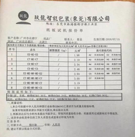 近日,玖龍智能包裝(東莞)有限公司的一份《紙板試機報價單》在坊間流傳。一石擊起千層浪!造紙大鱷開始向下游收割了! 二級廠眼里的“狼”終于來了!