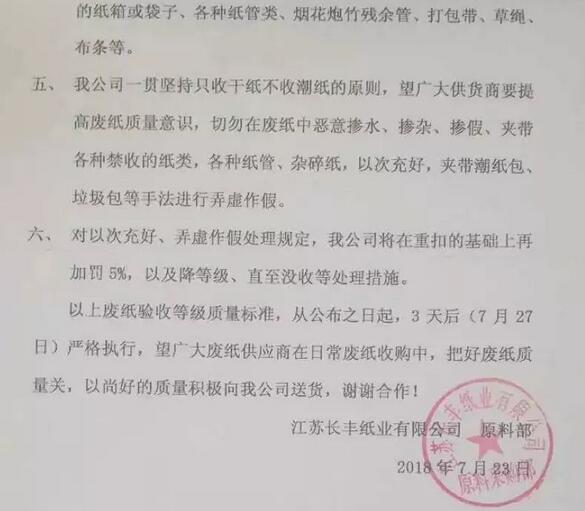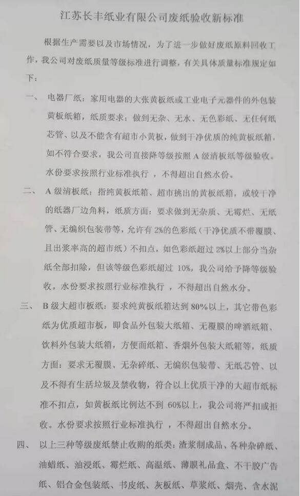 各廢紙供應(yīng)商:從明日(7月24日)起,我公司將試執(zhí)行新廢紙質(zhì)量等級(jí)標(biāo)準(zhǔn),試執(zhí)行期為3天,3天后(7月27日)將嚴(yán)格遵照新標(biāo)準(zhǔn)執(zhí)行,具體新標(biāo)準(zhǔn)見(jiàn)以下圖片文件,執(zhí)行期間如有疑問(wèn)直接咨詢(xún)我公司原料部,望廣大廢紙供應(yīng)商,及時(shí)做好送貨安排,謝謝合作!江蘇長(zhǎng)豐紙業(yè)——原料部