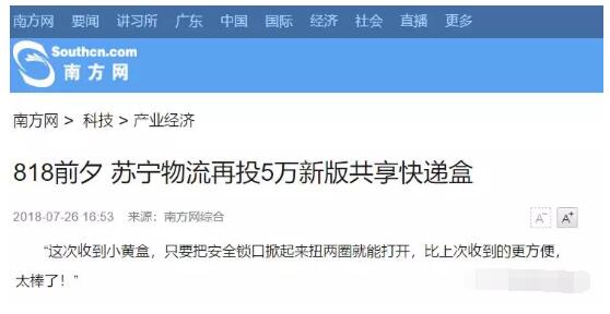 今年年初,蘇寧物流在北京推出升級版共享快遞盒,直接取代傳統紙質快遞盒,快遞員送貨上門時同步回收。截至目前,共享快遞盒已在全國實現規;瘧。 值得一提的是,818前夕,北京5萬個共享快遞盒還完成了全新升級,Spuer版強勢來襲。