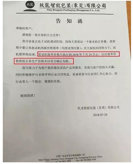 原料價格高就意味紙價高,隨著原料價格壓力的一路傳導,到最后是需要由消費者承擔,但國內(nèi)生產(chǎn)的紙制品在某些方面具有可替代性,例如:紙包裝會被循環(huán)新材料所替代,亦或者被國外進口的紙制品所替代。這意味著消費者擁有者更多的選擇,而這最后導致受傷的可能不僅僅是下游紙箱、包裝廠。更可能是整個行業(yè)。 行業(yè)發(fā)展仍需上下游相互信任,共同努力 導致這一系列問題原因是什么?很大程度上還是原料。目前原料哪里來?上游的廢品收購站、打包站。 作為整個紙品產(chǎn)業(yè)鏈的上游,打包站的重要程度可想而知。據(jù)悉,某些紙廠對供應商所供應的廢紙進行可追溯標記。也就是說,雖然抽檢的時候打包摻假、摻雜沒有被發(fā)現(xiàn),但是后續(xù)生產(chǎn)過程中發(fā)現(xiàn)是可以通過記錄追溯到供應商,進而影響到其信用評價。 還記得玖龍的低價紙嗎?7月24日,玖龍包裝發(fā)出最新告知函,表示:原試機接單價格只執(zhí)行到2018年7月24日止,以后接單按正常生產(chǎn)價格并以雙方確認為準。