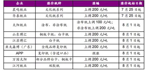 紙又漲價了,這次的漲價先行軍變成了木漿系用紙(文化紙、白卡紙),多家紙企近期發布漲價函,每噸漲價幅度100-200元之間。 有業內人士表示,8、9月份紙業旺季將至,文化紙有望率先進入漲價通道。