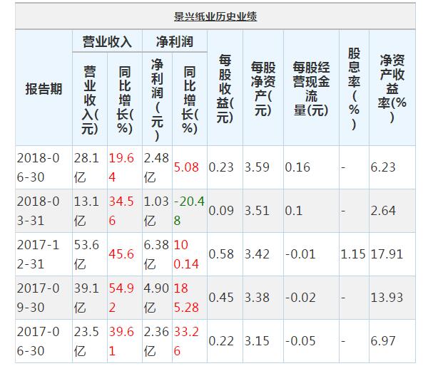 景興紙業主導產品為牛皮箱板紙、白面牛卡紙、紗管紙、高強度瓦楞原紙、紙箱等系列產品。地處長三角杭嘉湖平原中心地帶,瀕臨上海,地理條件優越,交通便利,是全國最大的三家以專業生產A級,AA級牛皮箱板紙為主的造紙企業之一。公司自1984年成立以來,以技術為依托,以品質求生存,以服務爭市場,以效益謀發展,由一家名不見經傳的造紙小廠發展成為擁有多家子公司的大型上市企業。現在的景興已然發展成以造紙為龍頭,集紙制品加工為一體的現代化企業。 近年來,公司的業績情況如下表所示: